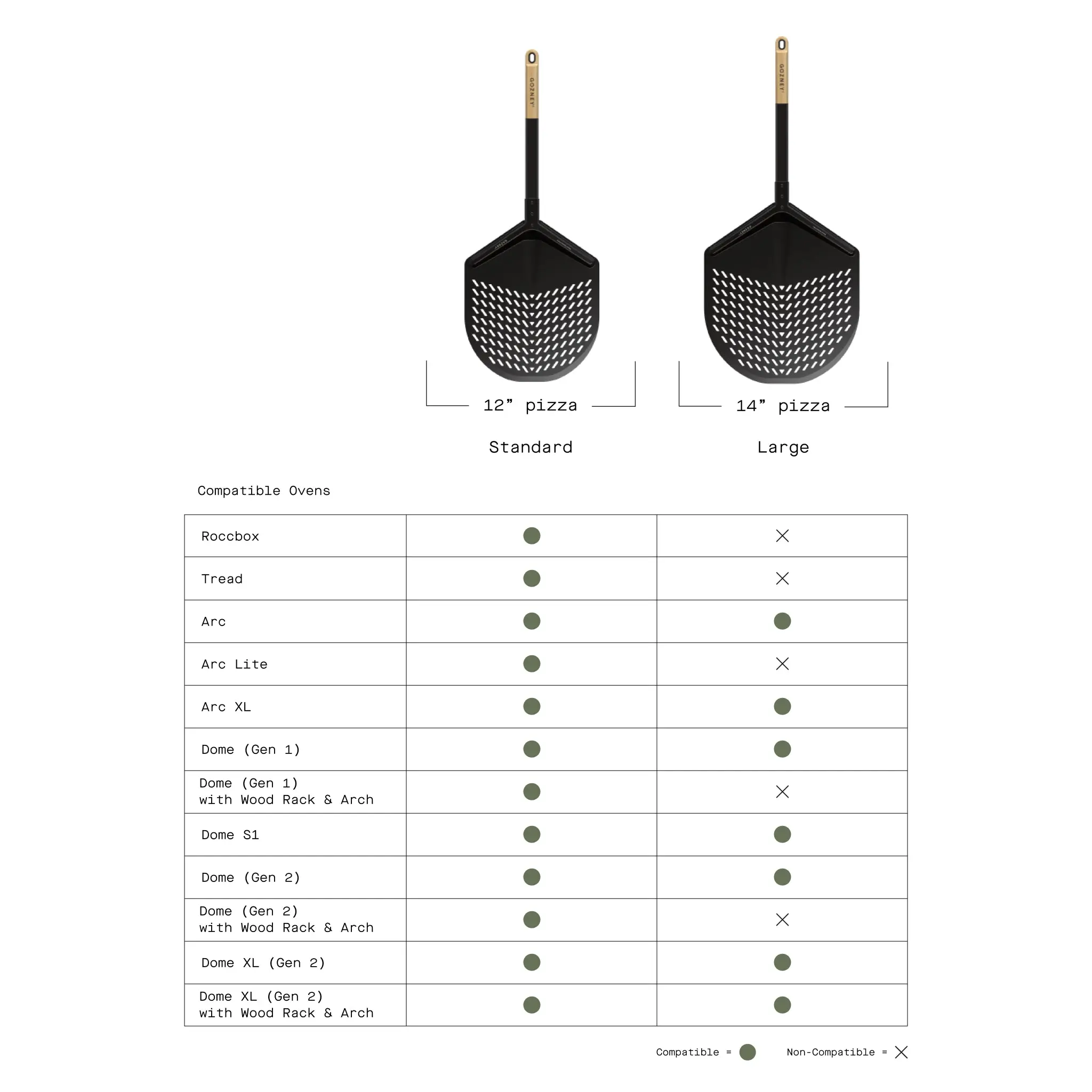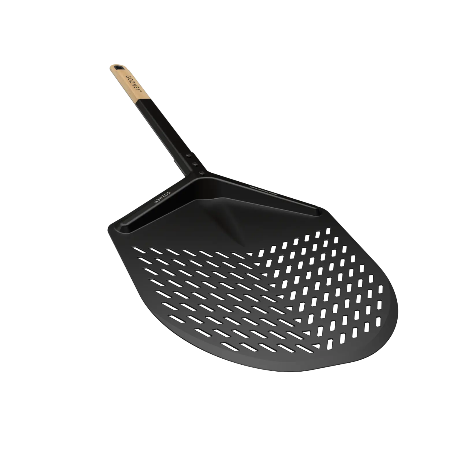 Pro Heber (12" M / 14" L / 16" XL) Das Instrument der Virtuosen. Entwickelt mit und für die besten Pizzaiolos der Welt, ist der Gozney Pro Heber ein Wunderwerk aus Gewichtsreduktion und Aerodynamik. Das extrem dünne Aluminiumblatt ist vollständig perforiert. Überschüssiges Mehl, das andernfalls auf dem Stein bitter verbrennen würde, fällt durch diese Löcher einfach ab. Die spezifische, abgeflachte Nase (Flat Nose) verleiht der Pizza beim Einschießen absolute Stabilität und verhindert ein seitliches Kippen. Für Anwender, die das Optimum an Performance fordern.