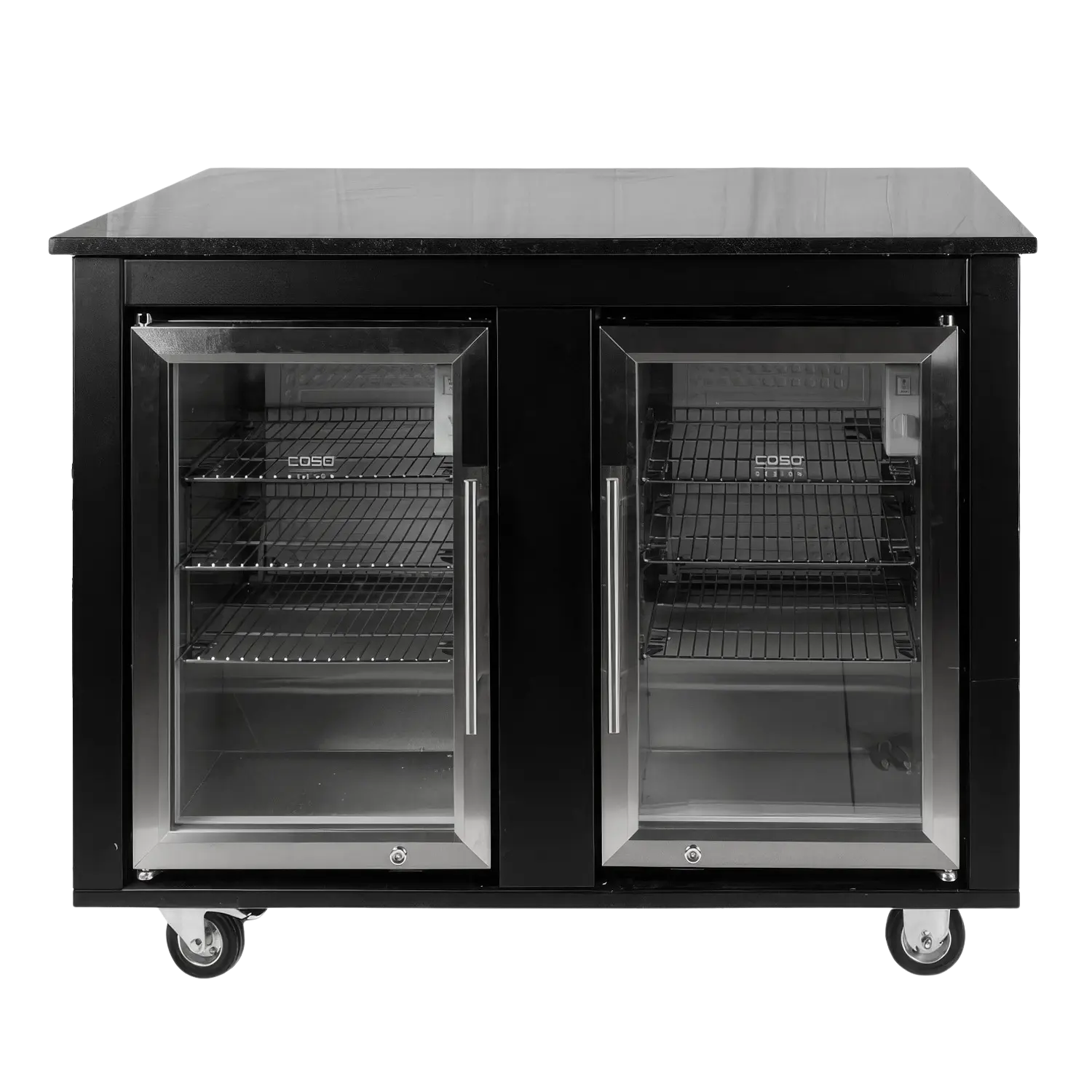 Im Alltag ist der größte Vorteil ganz klar die Kühlung: Zwei Outdoor-Kühlschränke bieten zusammen 126 Liter Stauraum, mit LED-Licht und herausnehmbaren Einlegeböden. Die Glastüren sind 3-lagiges Isolier-Sicherheitsglas mit UV-Filter – praktisch, wenn das Modul viel draußen steht. Die Granitplatte ist hart, hitzebeständig und lässt sich einfach abwischen. Ideal, wenn mal was Heißes drauf muss oder beim Belegen etwas kleckert.