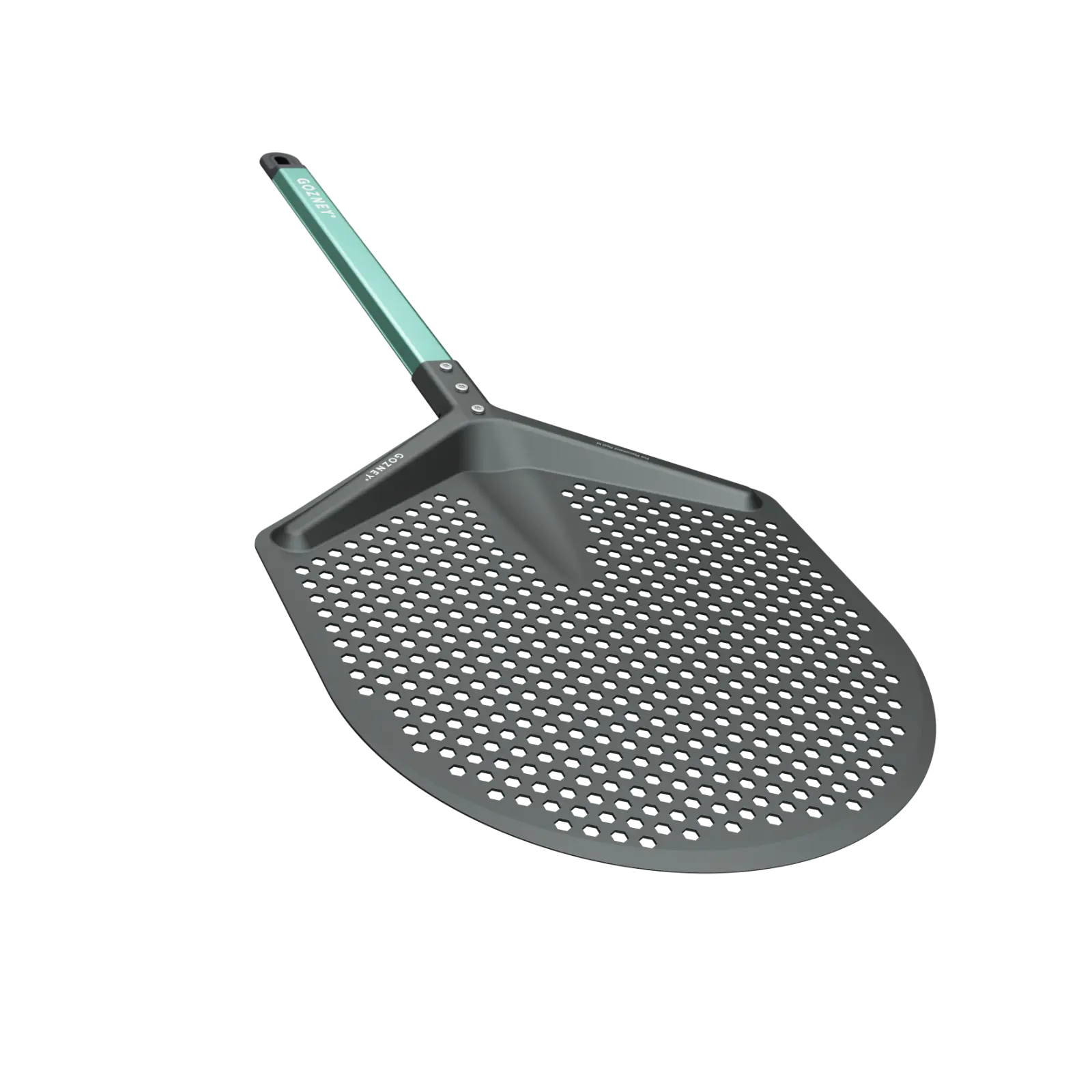 Pro Heber (12" M / 14" L / 16" XL) Das Instrument der Virtuosen. Entwickelt mit und für die besten Pizzaiolos der Welt, ist der Gozney Pro Heber ein Wunderwerk aus Gewichtsreduktion und Aerodynamik. Das extrem dünne Aluminiumblatt ist vollständig perforiert. Überschüssiges Mehl, das andernfalls auf dem Stein bitter verbrennen würde, fällt durch diese Löcher einfach ab. Die spezifische, abgeflachte Nase (Flat Nose) verleiht der Pizza beim Einschießen absolute Stabilität und verhindert ein seitliches Kippen. Für Anwender, die das Optimum an Performance fordern.