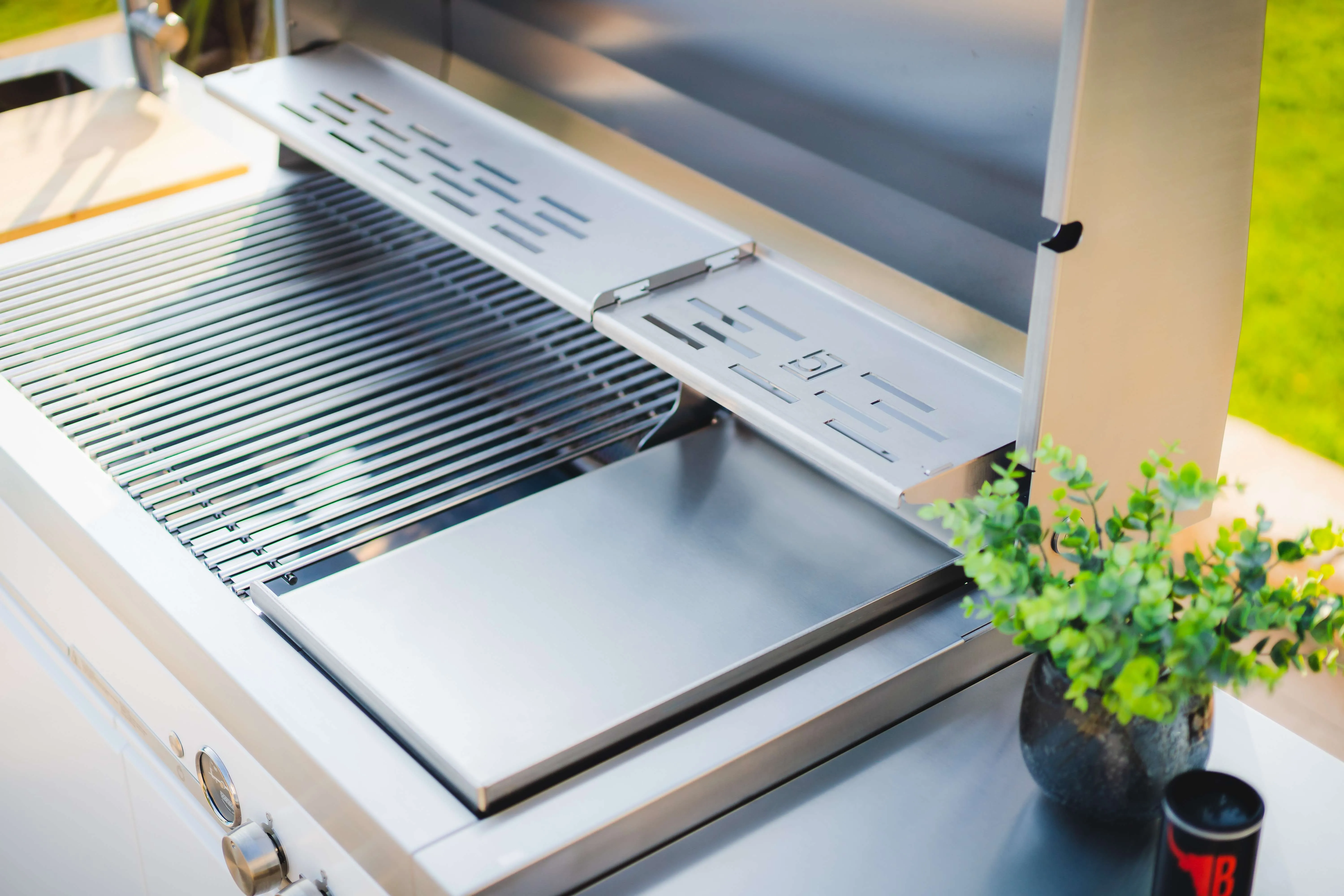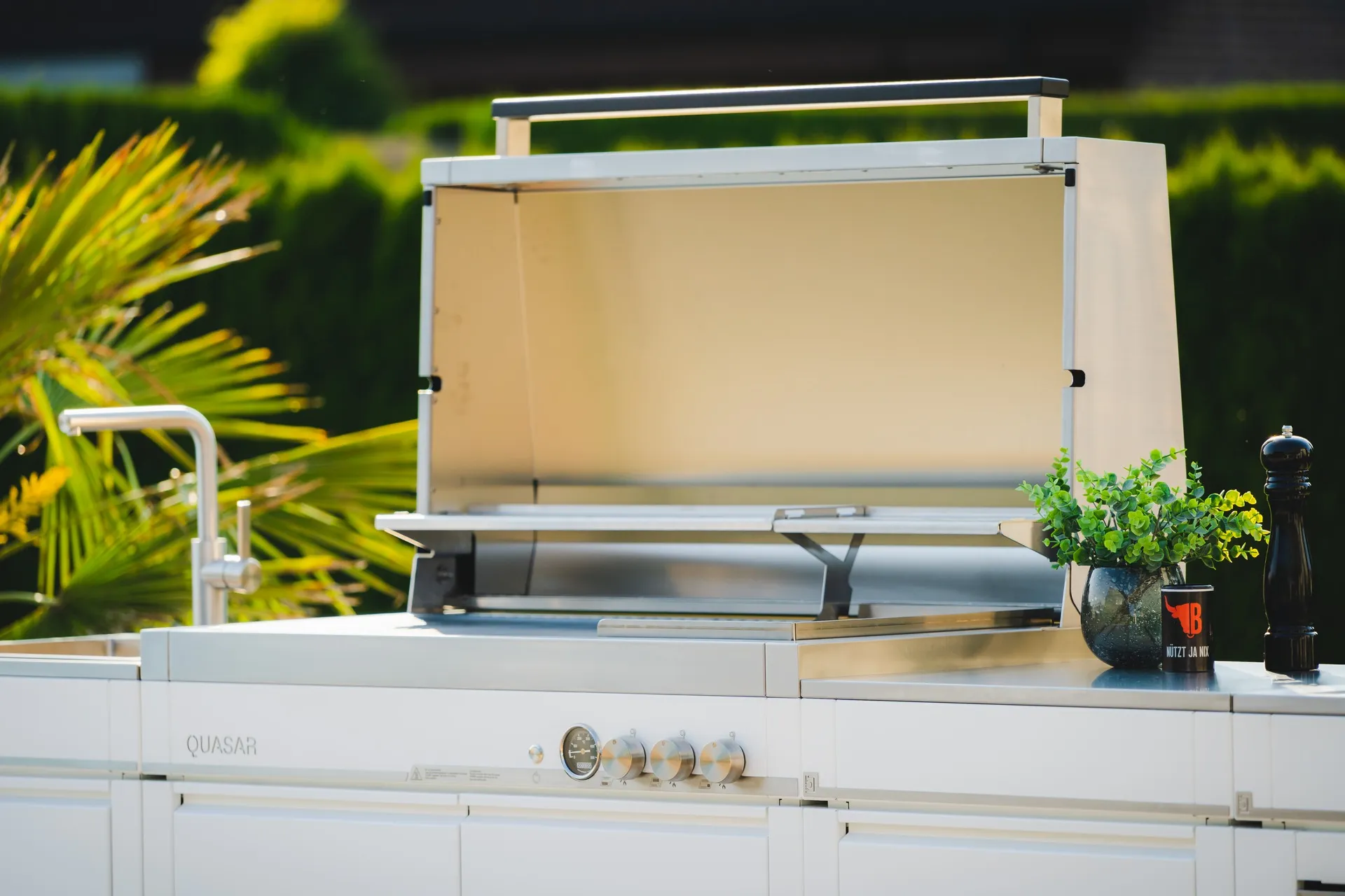 Der Quasar ist ein massiver Gasgrill auf einem fahrbaren Unterschrank, gedacht als feste Grillstation – aber trotzdem beweglich. Du bekommst eine große Hauptgrillfläche, die stark auf indirektes Grillen ausgelegt ist, plus eine sehr heiße Sizzle Area für Steaks. Unten im Schrank verschwindet Zubehör, welches sauber verstaut werden kann, da es für jedes Zubehörteil ein extra Fach gibt. So ist alles sinnvoll und ordentlich angeordnet und du hast Platz für weiteres Zubehör. Auch die Gasflasche kann sauber im Unterschrank stehen. Optisch kommt diese Variante in Polarweiß, RAL 9016, pulverbeschichtet im seidenmatten Finish.