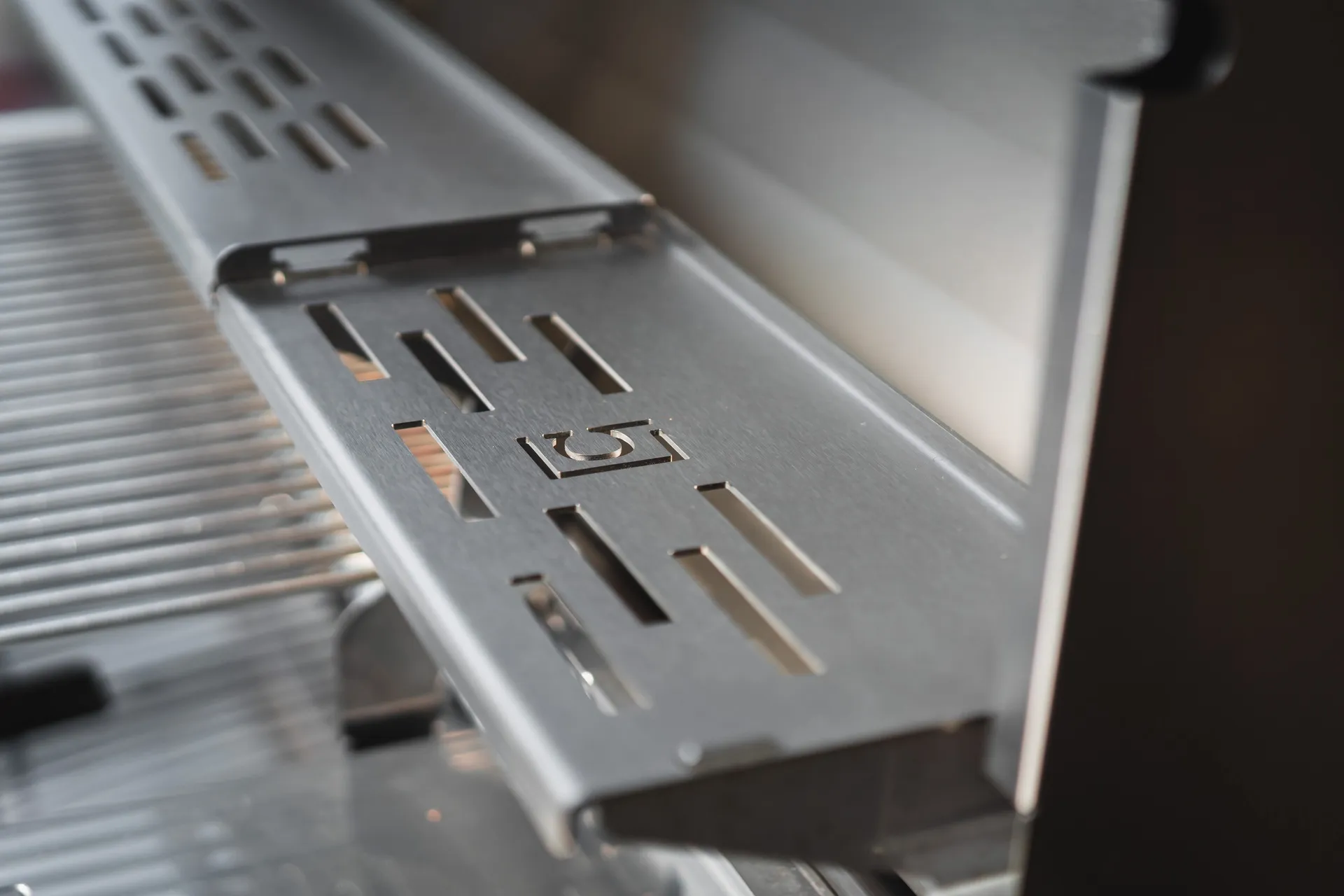 Im Alltag ist das Besondere beim Quasar die Brenner-Anordnung: Die zwei Hauptbrenner stehen vorne und hinten, dadurch grillst du in der Mitte sehr gleichmäßig indirekt über Infrarotstrahlung – das hilft, damit Fleisch saftig bleibt und Fett nicht ständig aufflammt, weil es nach unten in die Fettauffangschale tropft. Für das Finish nutzt du die Randbereiche mit direkterer Hitze. Die Hauptgrillfläche hat 2835 cm², dazu kommt die Sizzle Area, bei der ein 3,5 kW Brenner für Temperaturen von bis zu max. 800°C sorgt. Insgesamt liegen die zwei Hauptbrenner bei 12 kW plus den Brenner der Sizzle Area mit 3,5 kW.