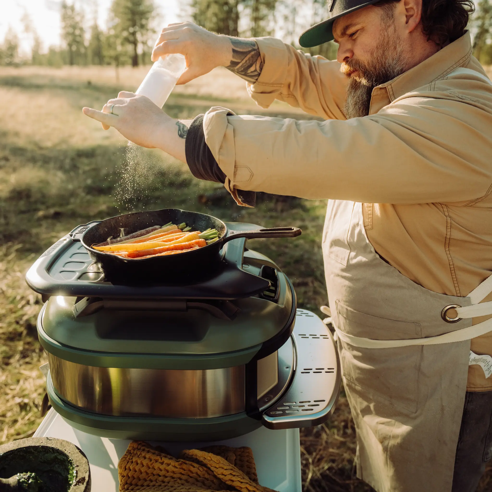 Wo in der Wildnis oder auf der Heckklappe des Autos der Platz fehlt, bereite Dir hier bequem Deine Toppings vor oder schneide die dampfende Pizza. Nimmst Du das Brett ab, offenbart das Aluminium-Rack seine zweite Funktion: Eine extrem hitzeresistente Ablagefläche, um lodernd heiße Gusseisenpfannen direkt aus dem Ofen sicher abzustellen. Ein Meisterwerk modularer Logistik.